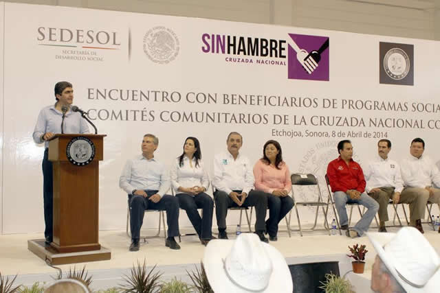 Durante un encuentro con beneficiarios de los programas sociales de la Sedesol y de integrantes de los Comités de Participación Social, y acompañado por el gobernador Guillermo Padrés Elías; la directora general de Políticas Sociales de la Sedesol, Martha Angón Paz, y el delegado de la dependencia en Sonora, Rosario Rodríguez Quiñones, el subsecretario resaltó la prioridad de sumar esfuerzos para mejorar las condiciones de vida de los sonorenses para lograr los objetivos de la Cruzada Nacional Contra el Hambre.