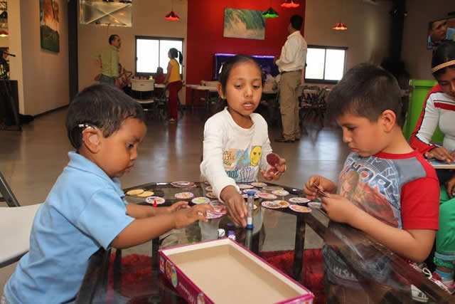 En la sala de estar hay varias madres que platican, mientras sus hijos se entretienen con juegos de mesa; entre ellos está Gabriela Esmeralda, quien nació sin un brazo y con deformaciones en los dedos en el otro.