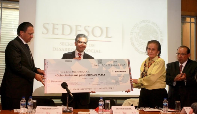 La Secretaría de Desarrollo Social (Sedesol) entregó a la Cruz Roja Mexicana los recursos aportados por sus funcionarios y personal, con motivo de la Colecta Anual 2014, como una forma de contribuir a las labores que la Benemérita Institución realiza en favor de la población en general, además de agradecer el trabajo conjunto que realiza para atender situaciones de emergencia en el país y para capacitar a más de 19 mil responsables y asistentes de estancias infantiles afiliadas a la dependencia.