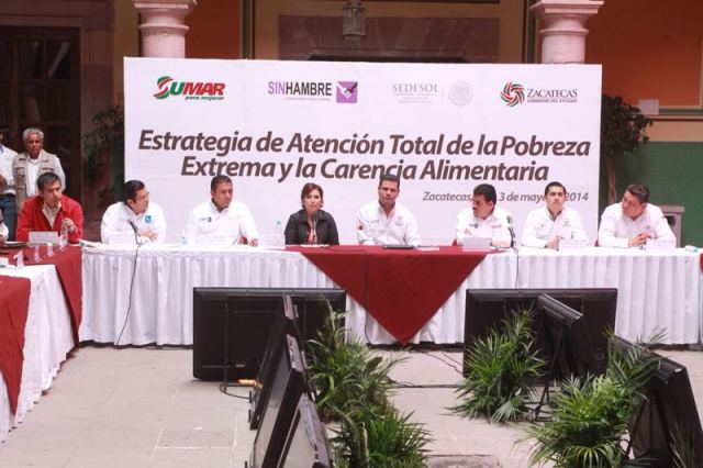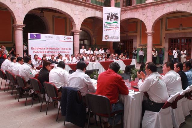 En la presentación de la Estrategia de Atención Total de la Pobreza Extrema y Carencia Alimentaria en Zacatecas, estuvieron el secretario estatal de Desarrollo Social, José María González Nava, y el director general adjunto de Análisis e Información de la Estrategia Delegacional de la Coordinación de Delegaciones de la Sedesol, Marcos Salvador Ibarra, así como los presidentes de los 58 municipios de la entidad.