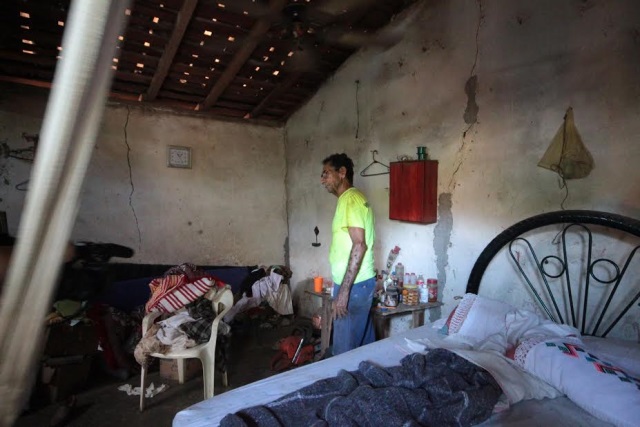 Esta pareja de adultos mayores ha vivido en esta casa con paredes de bajareque (mezcla de lodo, paja y madera) desde que vivían los papás de Don Daniel; ahora reciben la ayuda de la Sedesol, como resultado del recorrido casa por casa hecho por brigadistas de la dependencia en 28 municipios de la costa grande, para censar 9 mil 500 viviendas hasta el momento.