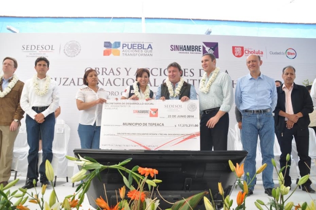 En el tercer punto de su recorrido, en San Pedro Cholula, dio a conocer que con la mezcla de recursos entre la Sedesol y los gobiernos de 71 municipios se realizarán obras de agua potable, drenaje, techos, baños y huertos de traspatio, con una inversión conjunta de alrededor de 400 millones de pesos.
