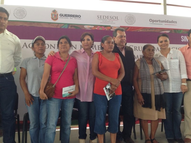 En este municipio donde inició la fase piloto de la Cruzada Nacional Contra el Hambre en el ámbito rural, la Titular de la Sedesol, acompañada por el gobernador Ángel Aguirre Rivero, y la directora de la Comisión para el Desarrollo de los Pueblos Indígenas (CDI), Nubia Mayorga Delgado, inauguró una olla captadora de agua que funcionará en época de estiaje; supervisó la construcción de la red de drenaje y alcantarillado de la comunidad; recorrió un invernadero de producción de jitomate y visitó el comedor comunitario, donde diariamente se sirven dos alimentos calientes a niñas, niños, mujeres, adultos mayores y personas con discapacidad.