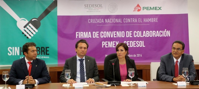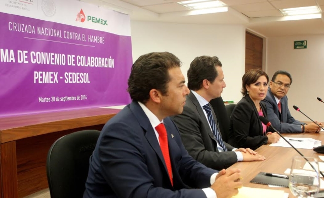 Los titulares de la Secretaría de Desarrollo Social (Sedesol) y Petróleos Mexicanos (Pemex) firmaron un convenio de colaboración para apoyar a los habitantes de las comunidades petroleras; en el marco de la Cruzada Nacional contra el Hambre, la empresa petrolera invertirá 71 millones de pesos para construir 130 comedores comunitarios en Campeche, Tabasco, Tamaulipas y Veracruz.