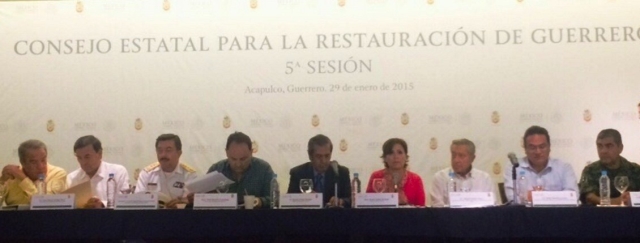 ACAPULCO, GRO., a 29 de enero de 2015.- Al presidir la Quinta Sesión del Consejo Estatal para la Restauración de Guerrero, la cual encabeza Miguel Alemán Velasco, la secretaria de Desarrollo Social, Rosario Robles Berlanga, declaró llegar a la sesión para un ejercicio de transparencia y rendición de cuentas, a fin de informar lo que se ha hecho en un año y tres meses de trabajos de reconstrucción en el estado de Guerrero.