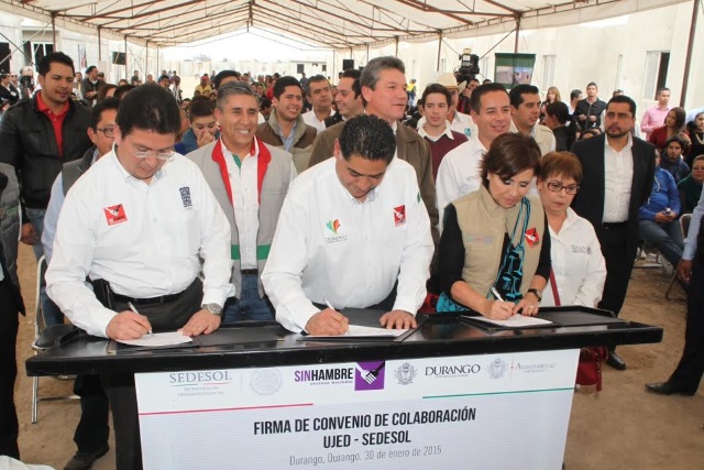 Durante el evento, la secretaria Robles Berlanga y el gobernador Herrera Caldera firmaron un convenio entre la Universidad Juárez del Estado de Durango y el Gobierno de la República, para fomentar las labores de diagnóstico y de participación en la Cruzada Nacional Contra el Hambre.