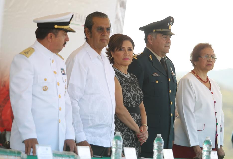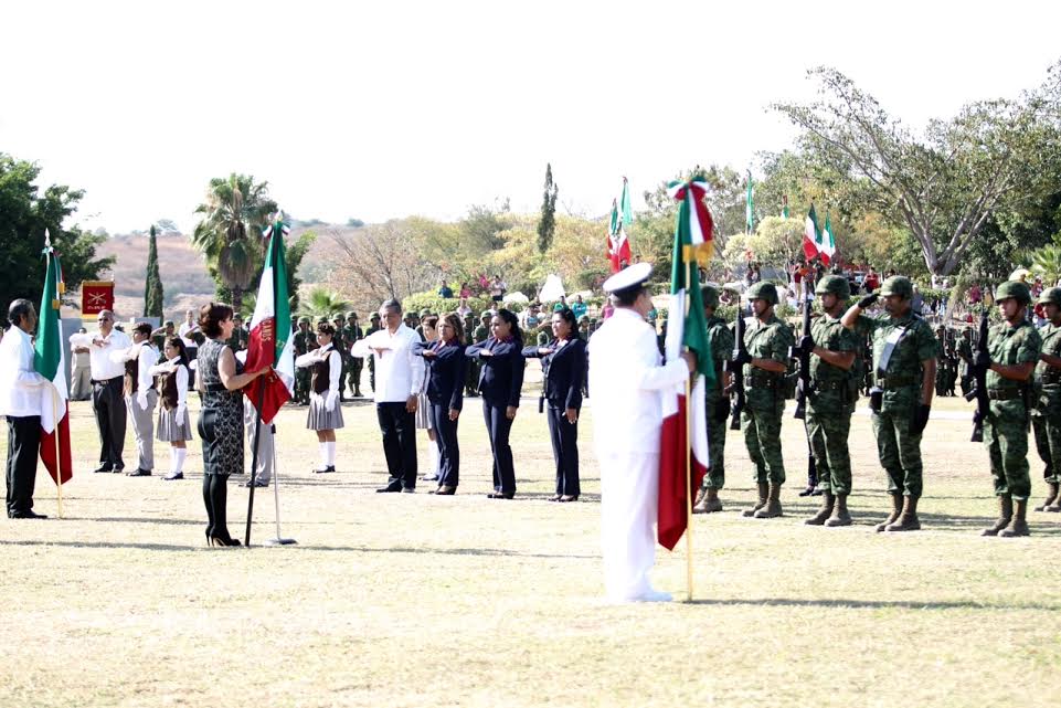 En el solemne acto, la secretaria Rosario Robles abanderó y tomó protesta a los integrantes de las escoltas del 27 Batallón de Infantería y de 41 escuelas de educación básica, media y media superior de Iguala, así como de organizaciones de la sociedad civil.