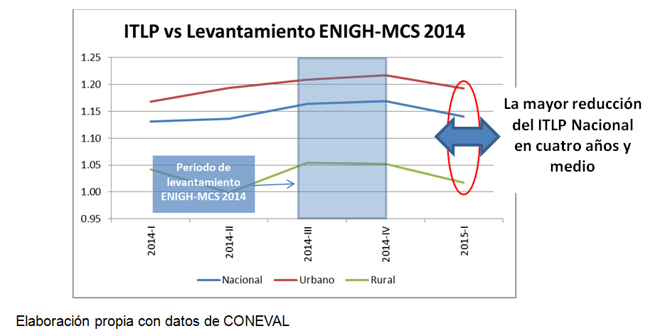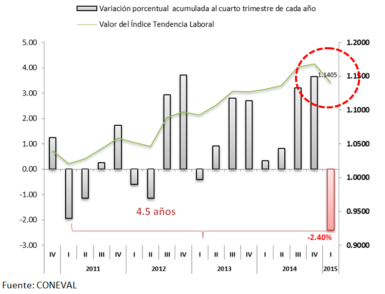 Es importante destacar que para el primer trimestre de 2015, de acuerdo al propio Coneval, hay mejores perspectivas, a pesar del entorno internacional adverso. El Índice de la Tendencia Laboral de la Pobreza presenta el mayor descenso en 4 años y medio (es decir, un mayor porcentaje de personas pueden adquirir sus alimentos con su ingreso laboral), en gran medida por la disminución en los costos de la luz, de la telefonía, la eliminación del incremento mensual del precio de las gasolinas, etc. Coincide también con la mejoría de diversos indicadores económicos, como el aumento de la inversión privada, en el consumo de las familias y en la generación de empleos, cuyo crecimiento durante el primer semestre de este año es el mayor observado en 10 años.