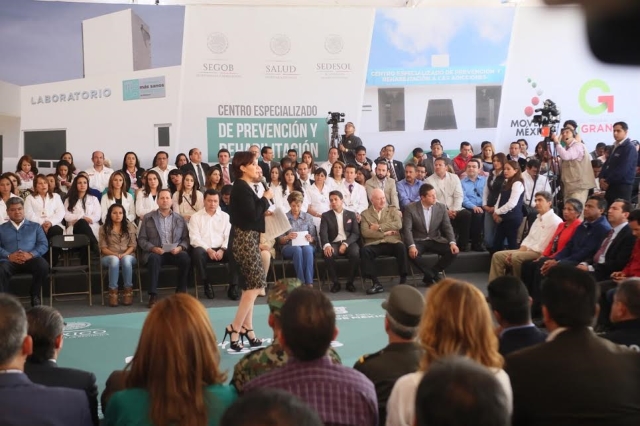 En el acto inaugural del Centro Especializado de Prevención y Rehabilitación de las Adicciones en esta localidad mexiquense –en cuya construcción la Sedesol aportó 18.7 millones de pesos mediante el Programa para la Atención de Zonas Prioritarias-, la secretaria Robles Berlanga afirmó que más allá de las estadísticas y del número de jóvenes que consumen drogas, el gran desafío institucional es mirar al fenómeno desde la perspectiva humana y social para, desde ahí, sumar esfuerzos y enfrentarlo.