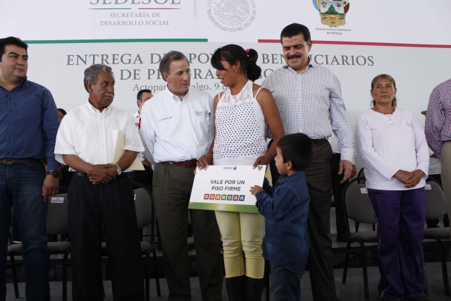 En el municipio de Actopan, Meade Kuribreña y Olvera Ruiz encabezaron la entrega de apoyos de diversos programas sociales, como 3x1 para Migrantes, para el desarrollo de Zonas Prioritarias (PDZP), Empleo Temporal (PET), Prospera, Seguro de Vida para Madres Jefas de Familia, así como pisos firmes y Cuartos Rosa.