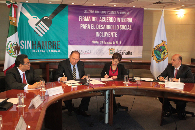 Finalmente, mencionó que el acuerdo firmado, que conviene recursos por 2 mil 278 millones de pesos, tiene dos grandes apartados. El primero se refiere a la Cruzada Nacional Contra el Hambre, que atenderá los municipios de Torreón y Saltillo, donde habitan 32 mil 589 personas en condición de pobreza extrema y carencia alimentaria, mientras que el segundo atañe a los programas de la Sedesol que se aplicarán en el estado.