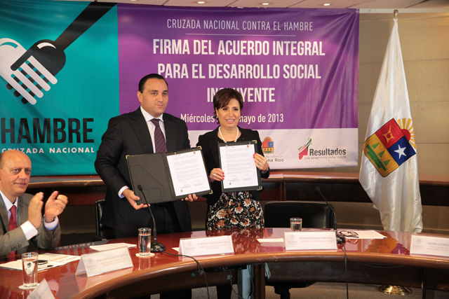 Con un llamado a trabajar en favor de los más pobres del país, sin distingos de partidos o ideologías, la secretaria de Desarrollo Social, Rosario Robles Berlanga, y el gobernador de Quintana Roo, Roberto Borge Angulo, firmaron el Acuerdo Integral para el Desarrollo Social Incluyente - Cruzada Nacional Contra el Hambre.